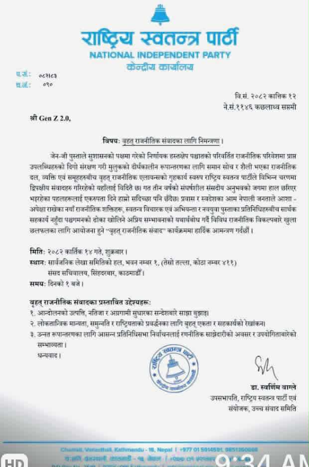 GENZ 2.0 लाई बृहत राजनितीक संवादका लागी राष्टिय स्वतन्त्र पाटीGENZ 2.0 लाई बृहत राजनितीक संवादका लागी राष्टिय स्वतन्त्र पाटीको निमन्त्रणा