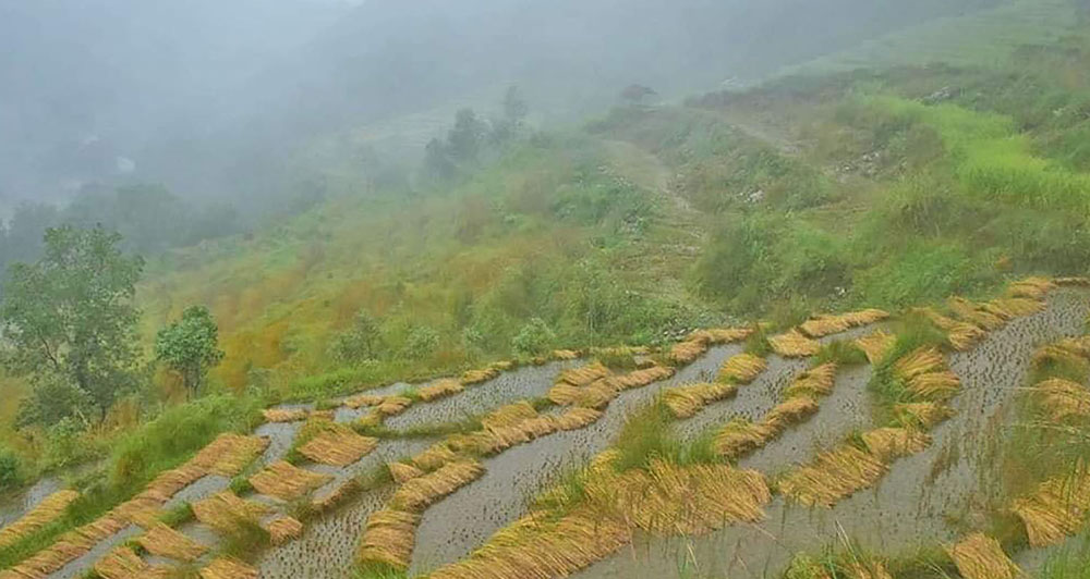 गुल्मीको इस्मा गाउँपालिका–६ अम्मरपुरकी दुर्पता भण्डारी परिवारले आफ्नो छ रोपनी खेतमा असारको मध्यतिर धान रोप्नुभयो । उक्त धान अहिले काट्ने समय हो । यसैले असोज २९ गते खेताला लगाएर धान काट्नुभयो । लगत्तै बेमौसमी वर्षा सुरु भयो । काटेको धान खेतमै डुब्यो ।