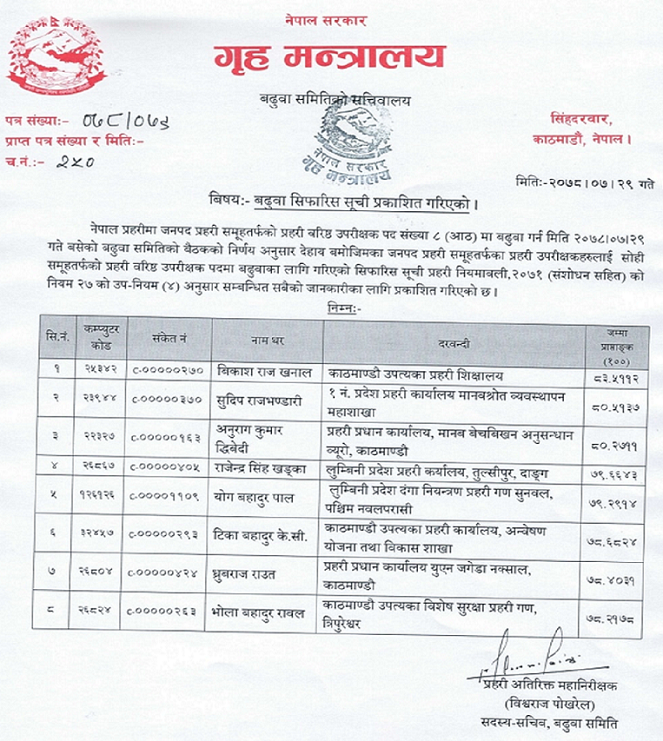 नेपाल प्रहरीका आठ प्रहरी उपरीक्षक प्रहरी वरिष्ठ उपरीक्षक (एसएसपी) मा बढुवाका लागि सिफारिस हुनुभएको छ ।गृहमन्त्रालयको बढुवा सिफारिस समितिका अनुसार जनपद प्रहरी समूहतर्फका उहाँहरुलाई सोमबारको निर्णय अनुसार बढुवाका लागि सिफारिस गरिएको हो । गृहसचिवका नेतृत्वमा सिफारिस समिति रहेको हुन्छ ।
