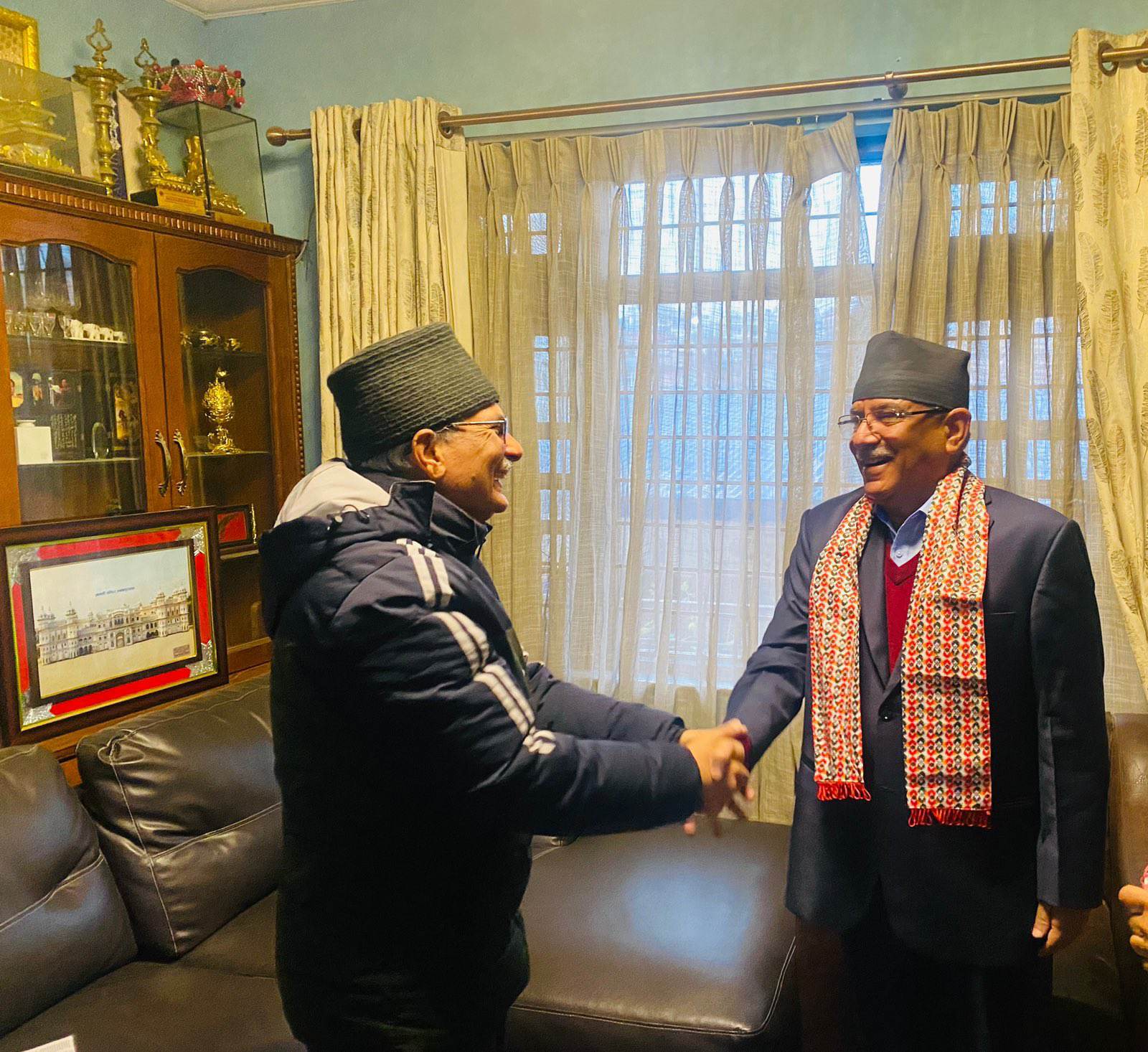 काठमाडौँ, ११ पुस । नेपाल समाजवादी पार्टीका अध्यक्ष डा. बाबुराम भट्टराईले नवनियुक्त प्रधानमन्त्री प्रचण्डलाई बधाई दिएका छन् । सोमबार बिहान प्रचण्ड निवास खुमलटार पुगेर भट्टराईले बधाई दिएका हुन् ।